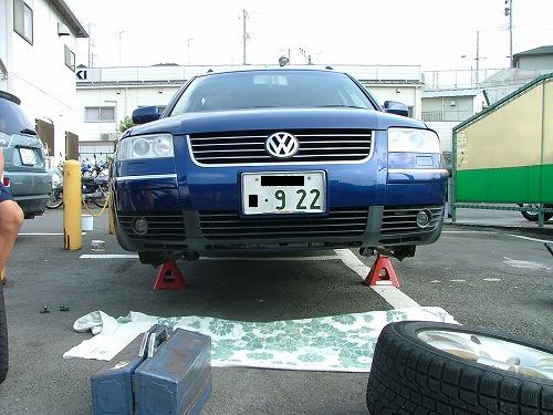 近くの洗車場での作業です。 ジャッキアップしてウマに載せます。 |